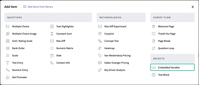 To add an embedded variable to your survey, open the "Add item" menu in your survey build, and select the "Embedded variable" option.