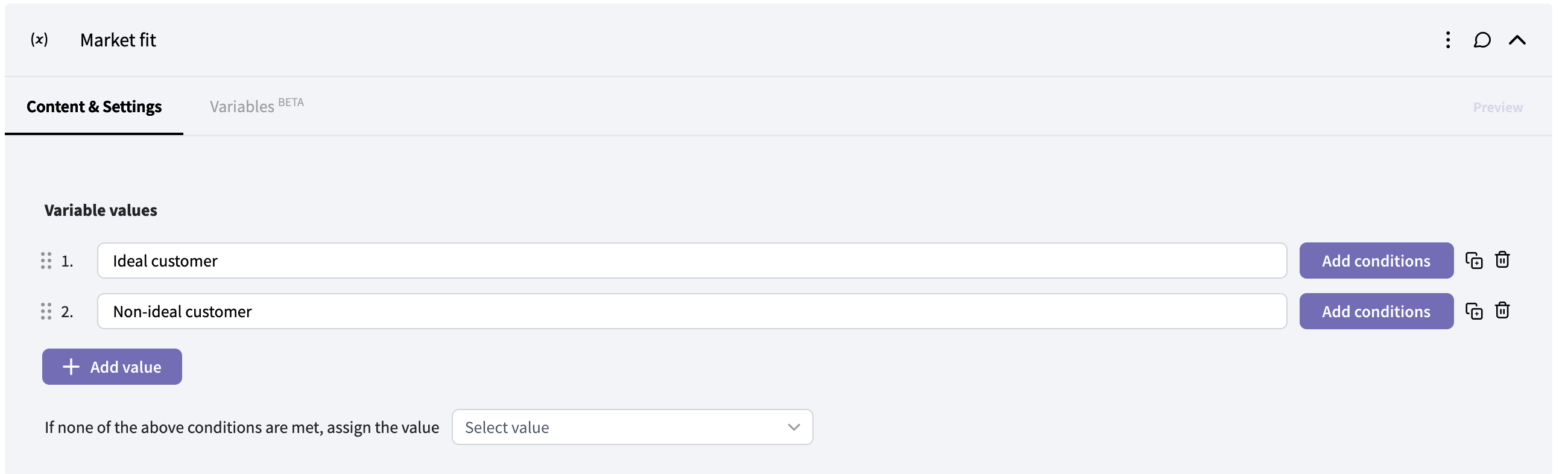 In the example below, our variable "Market fit" has two possible values: "Ideal customer" and "Non-ideal customer".
