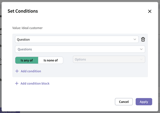 Next, set the conditions that will determine which value is assigned to each respondent by clicking the "Add conditions" button next to a value. You'll next see a modal to set the criteria that must be met to assign that value to a respondent.