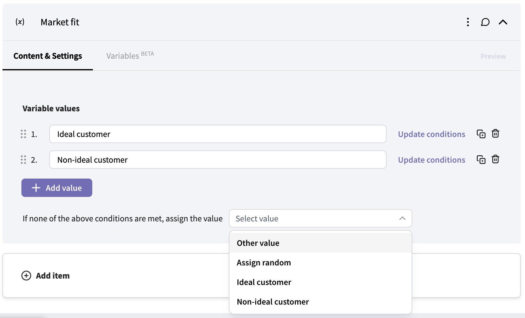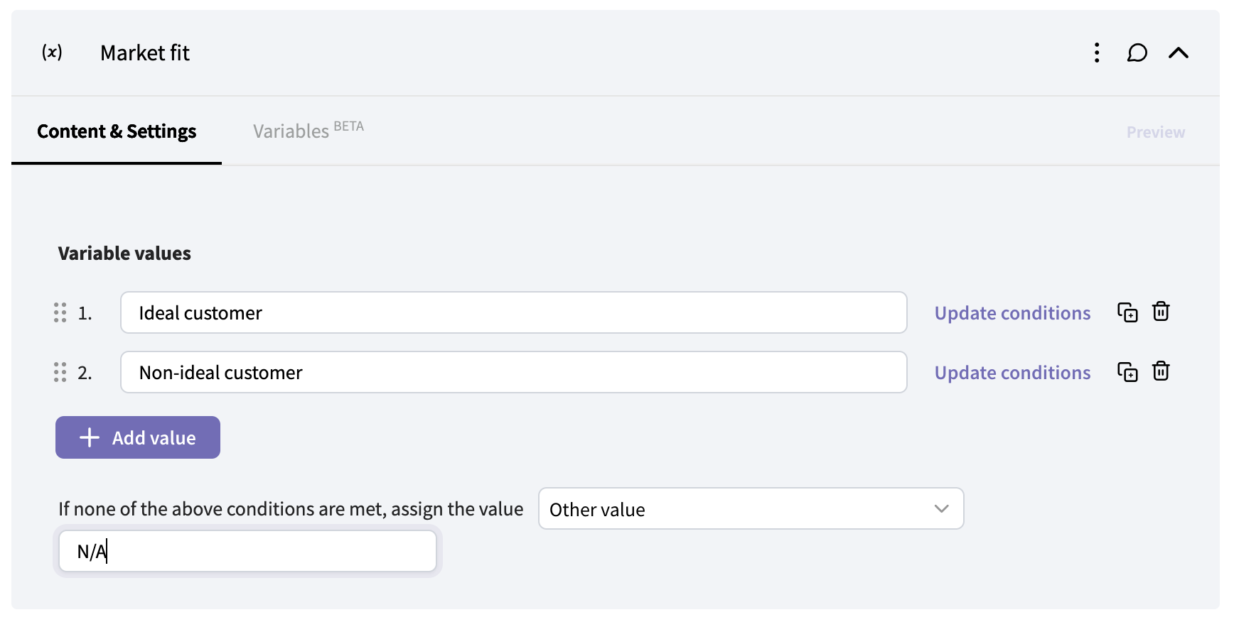 When you're finished creating the variable values and setting conditions, you'll need to specify which value should be given to respondents who do not fit into the criteria of any of the defined values.